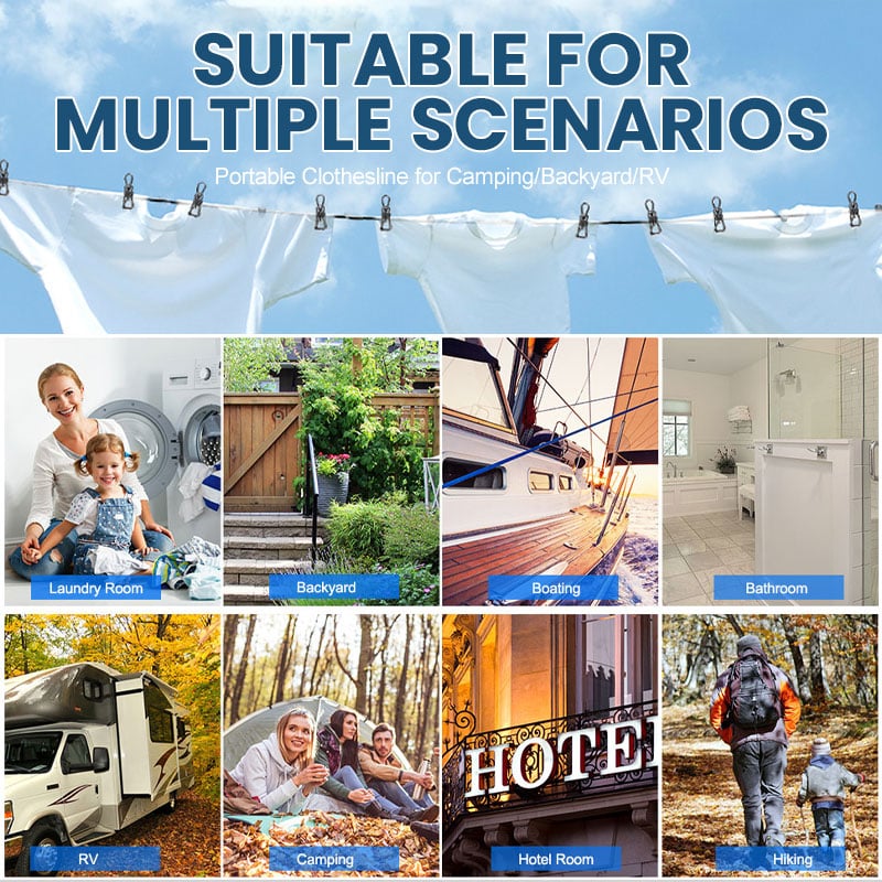 πAttaches Everywhere:Β Easy to fasten with two strong metal hooks. Portable travel clothesline can be fixed anywhere: hotel, bathroom, backyard, laundry room, RV, boat, balcony, or even fixed on trees.