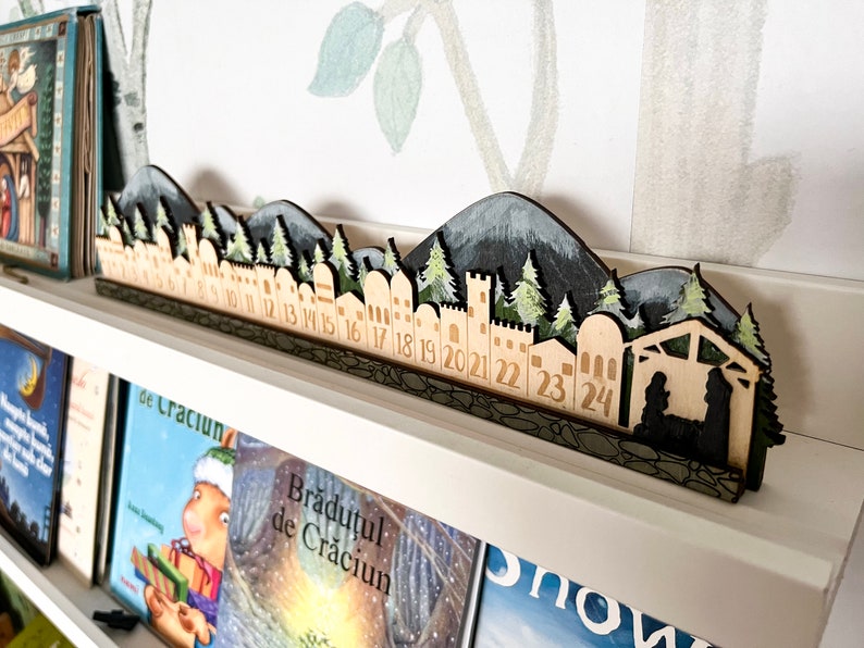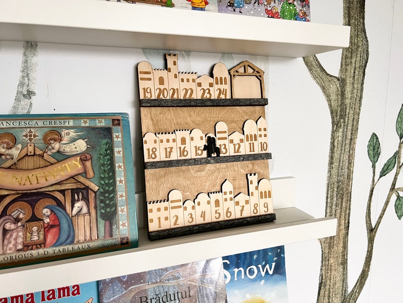 🥰The sign is made of multiple layers of wood and has a grove along the numbers that the characters move through. On Christmas switch out the counter piece to the nativity piece with baby Jesus.