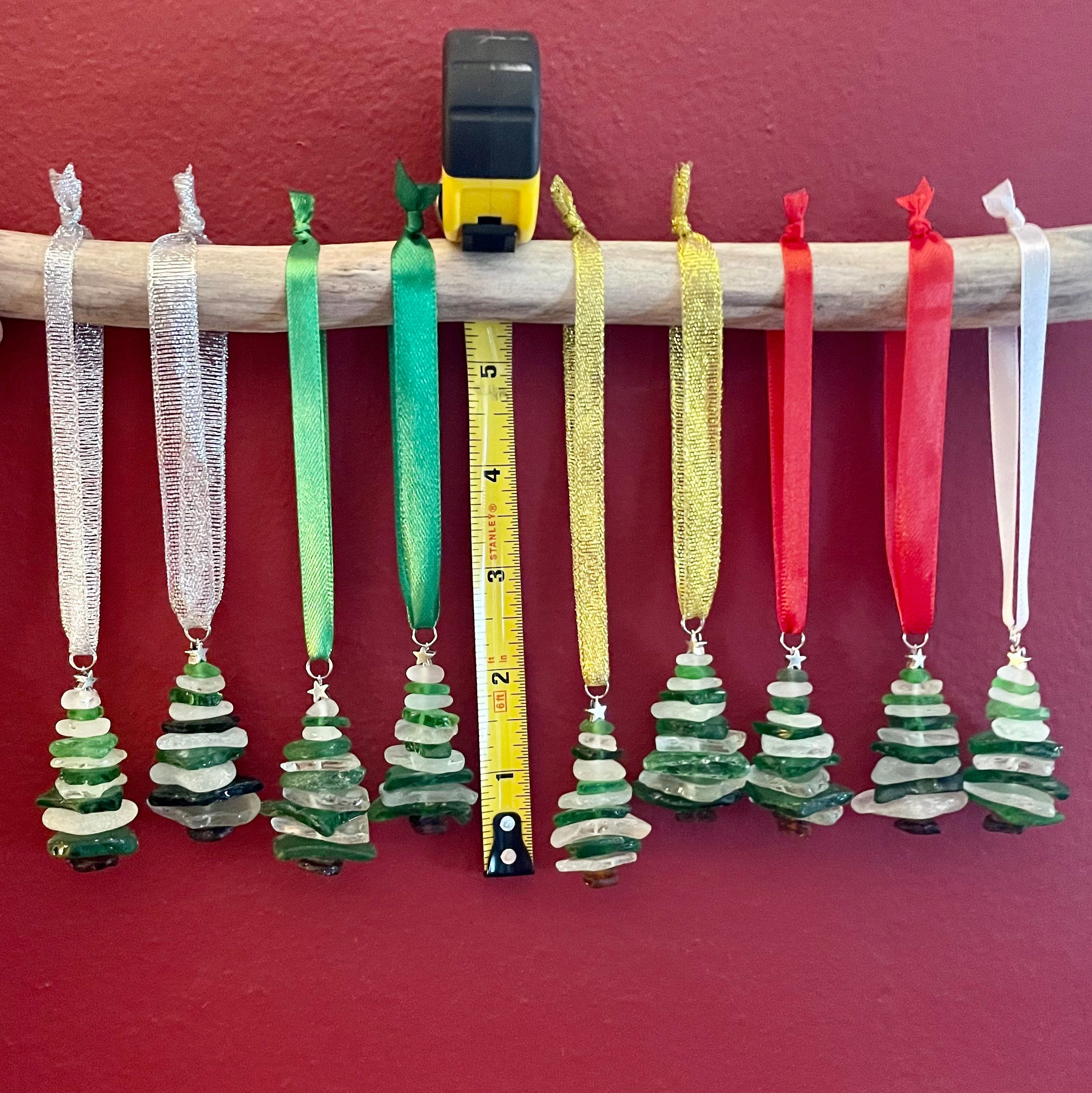 Each tree is made with approximately 12 pieces of beach glass topped with a 6mm silver star and between 1.5” and 2” tall.Use as a Christmas tree ornament or attach to a chain and wear it as a beautiful necklace.