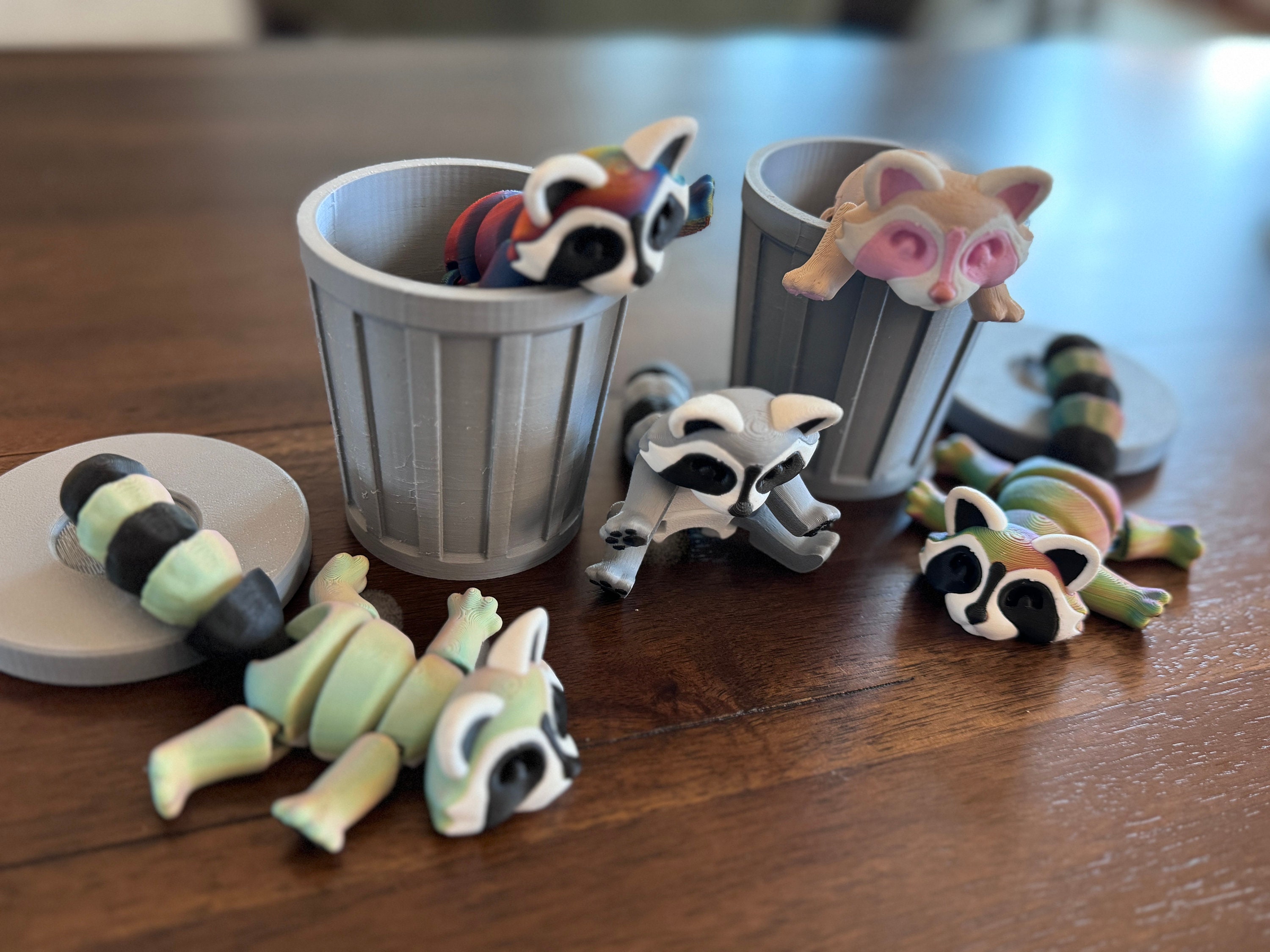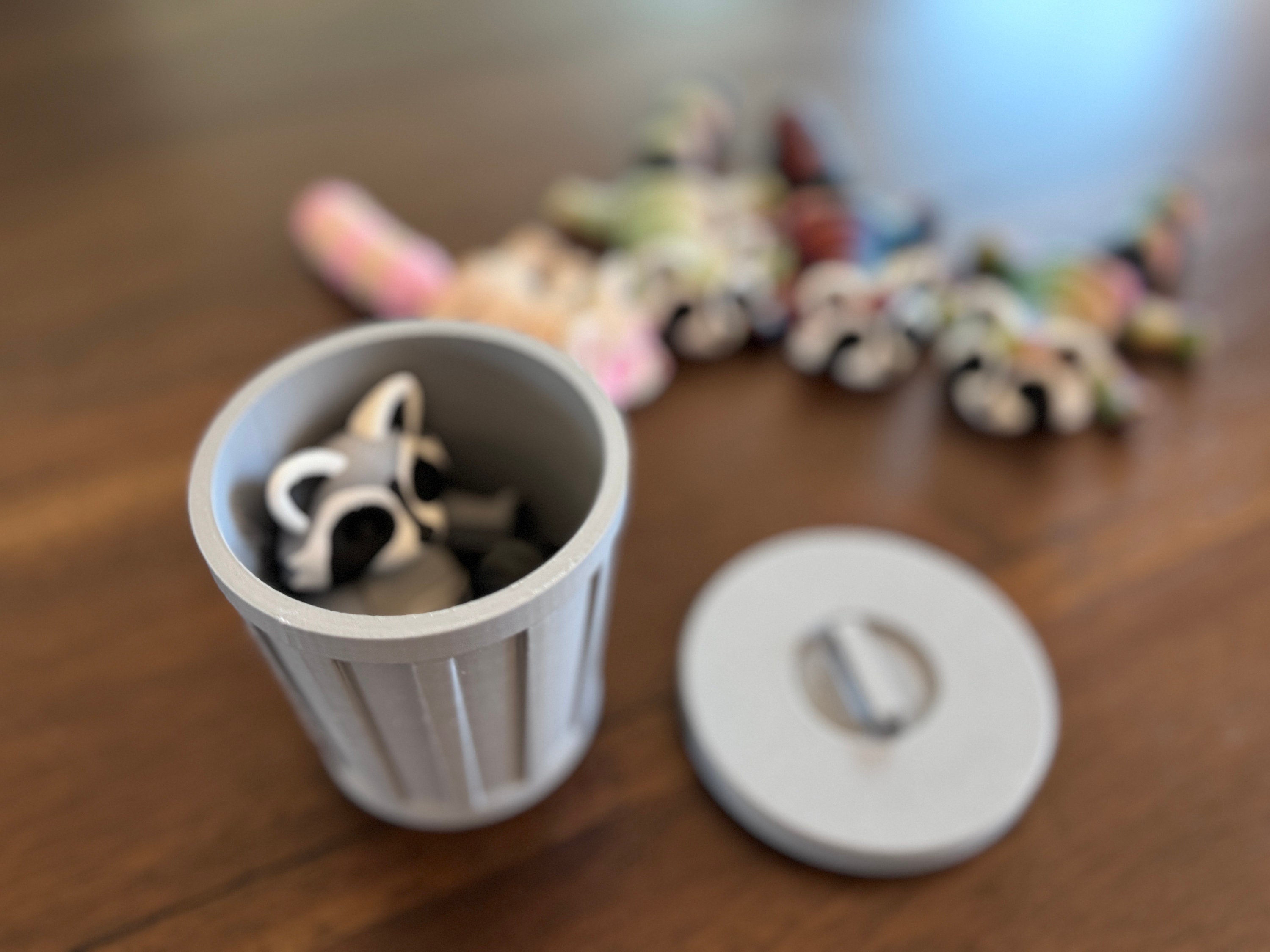 Raccoon and Trash Can🗑️: Raccoons are often found rummading through trash cans to find something to eat so they are also known as trash panda. Get them their own trash can! Our trash can storage containers are a cute and funny way to house your fidget toys and other trinkets.