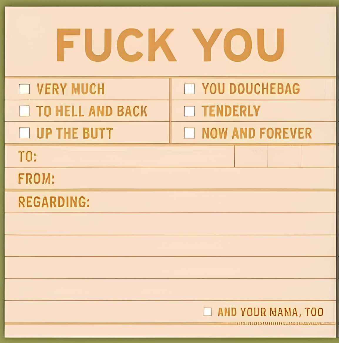 - FUCK YOU Notes: Whether it's "To Hell and Back" or "Up the Butt," these sticky notes perfectly express your true feelings when words just won’t cut it.
