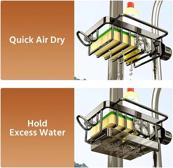 The faucet sponge holder can be used not only for the kitchen sink but also for the bathroom to store your shampoo, soap, and other items, get rid of clutter, and make your sink and countertops more organized. This faucet holder is very suitable for your kitchen, and bathroom.