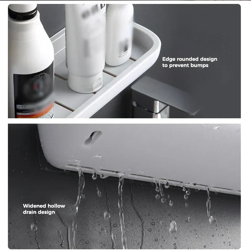 Useful Construction--Opened design with guardrail prevents items from falling. The base has drain holes prevents sewage from accumulating, and 4 small no-slip bumps which helps to hold items in place.