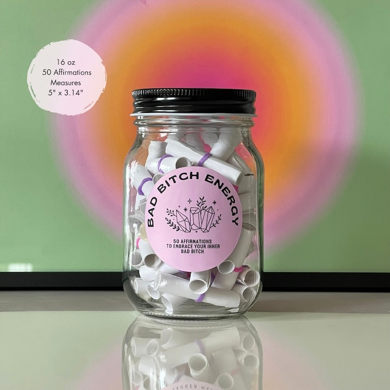 ✨Available in two sizes: a 32 oz glass jar with 100 affirmation cards and a 16 oz glass jar with 50 affirmation cards, both meticulously curated to ignite your Bad Bitch Energy.