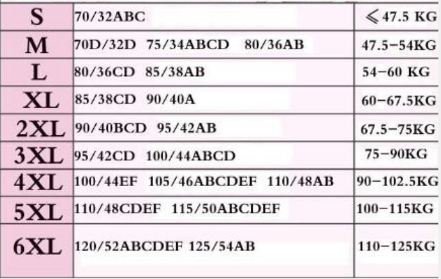 | Size | Under Bust(cm) | Weight (kg) | Cup |