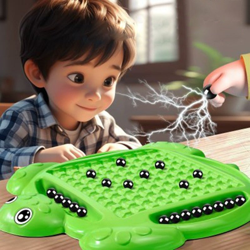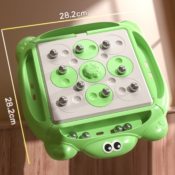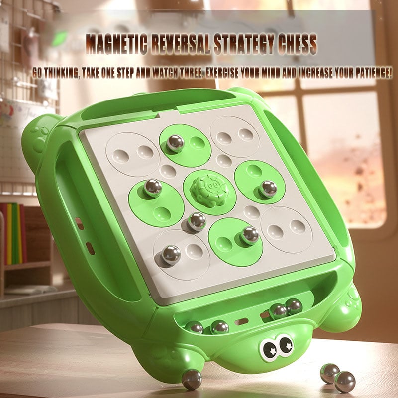 The game begins with each player holding ten pieces. Players take turns placing one piece on the board each time. After placing a piece, the player must press the mechanism in the middle to rotate the board. The winner is the one who empties their hand of all pieces first. During the game, be cautious not to attract the pieces already on the board. If a piece is attracted, it must be retrieved and held in the hand until all pieces have been placed.