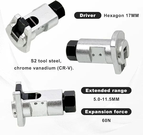 WIDE COMPATIBILITY - The extension range of this tool is 5-13MM and the outside Hexagon drive is 17mm which is compatible with most car equipped with a pinch bolt style hub.