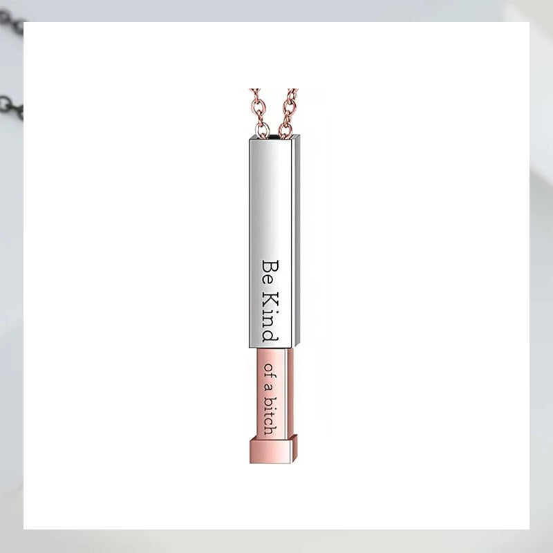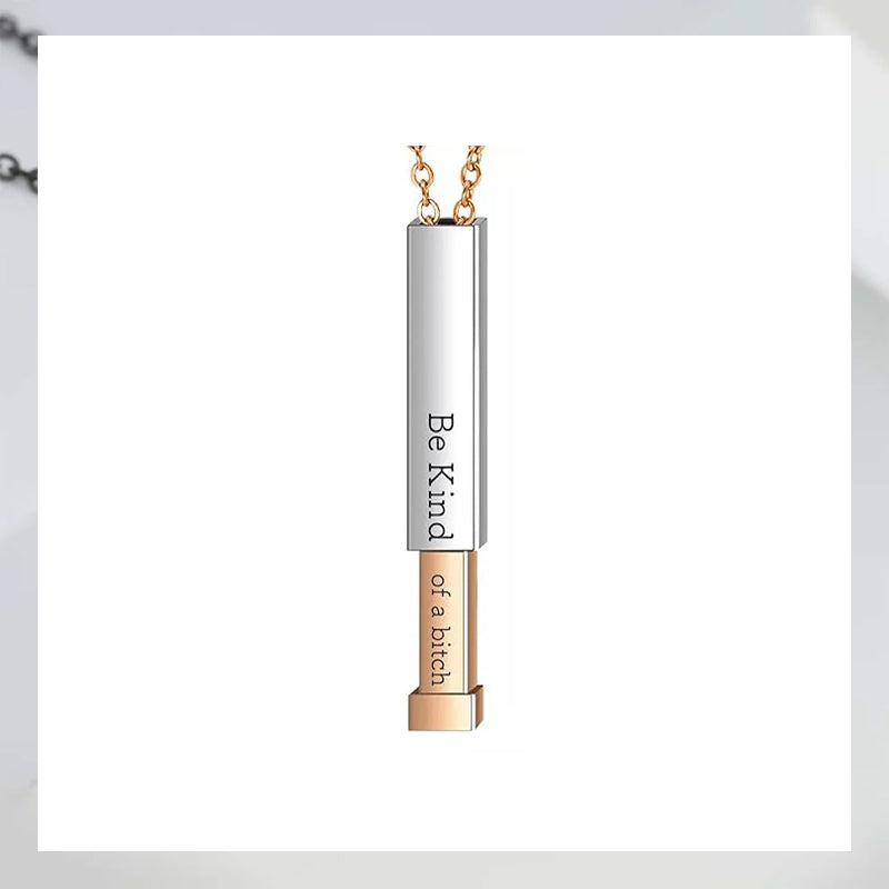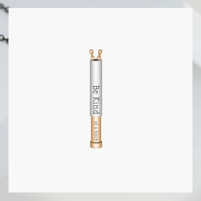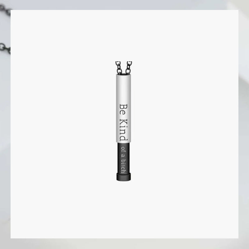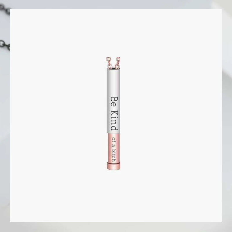 Crafted for those who enjoy kindness with a hint of humor and sass. Spice up your collection with this Hidden Message Necklace that comes with a delightful twist. On the outside it bears a thoughtful reminder to "Be Kind" but with a simple slide it reveals the true message "Be Kind ... of a bi♡ch". Kindness comes in many forms but the best one is when it makes everyone smile, and this necklace is guaranteed to put a smile on your face every time you glance at it. Surprise yourself or someone special with this empowering piece. It's the perfect gift for any occasion, adding a touch of humor to a heartfelt message.