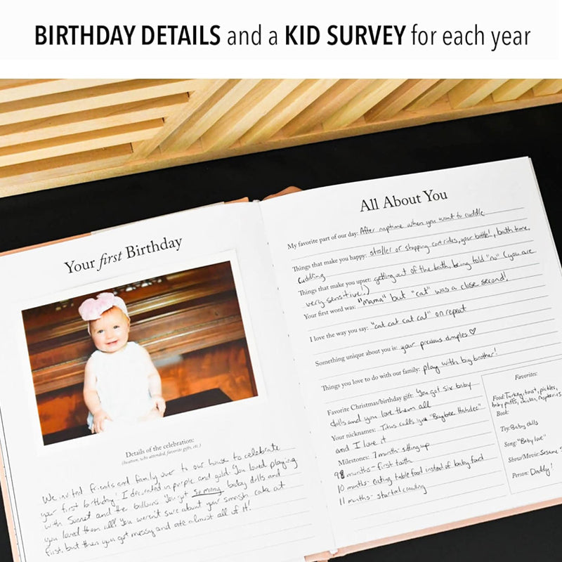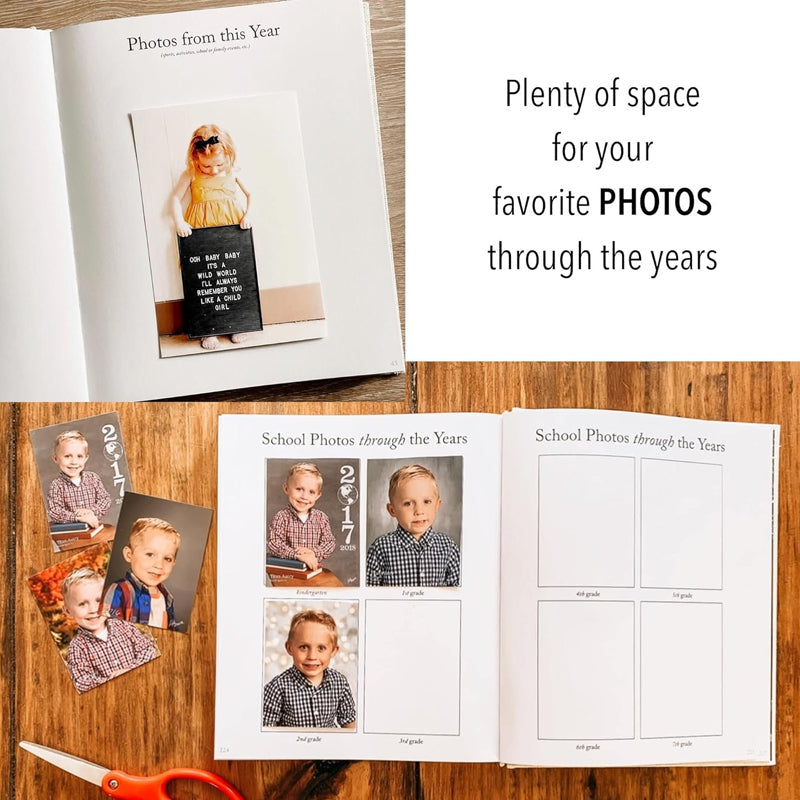 What’s Inside: Our guided journals begin with a section for birth and delivery (birth story, photos, birth status, handprints + footprints). Each following year has pages- Vision of the year, birthday celebrations, end-of-year prompt, & more. At the end of the new boy/girl book, you will find a four-page spread for all your child’s school photos.
