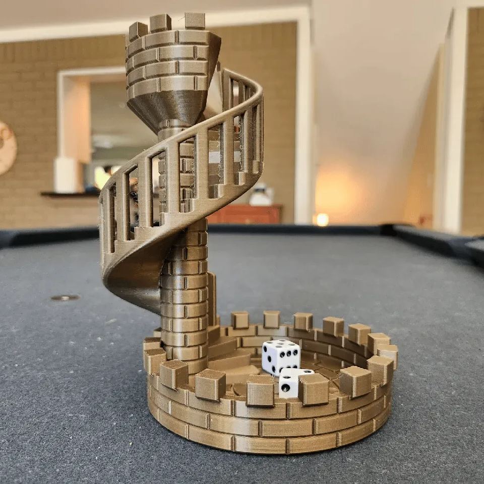 A dice tower with a funnel-style dice drop and intriguing spiral stair case