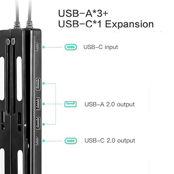 The USB interface supports hot swap, plug and play, and the system automatically recognizes and installs the driver.With 3*USB-A 2.0, 1* USB-C input, 1* USB-C output.