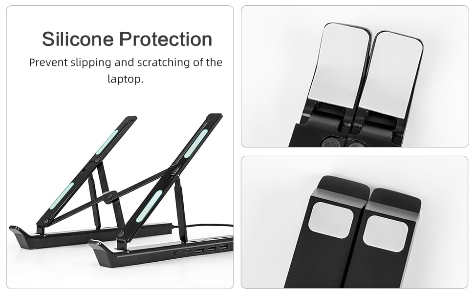 This cooling stand with silicone protection, non-slip and does not scratch the computer, can hold your laptop in place and protect any surface it is placed on,avoid unnecessary slipping during typing and reading.