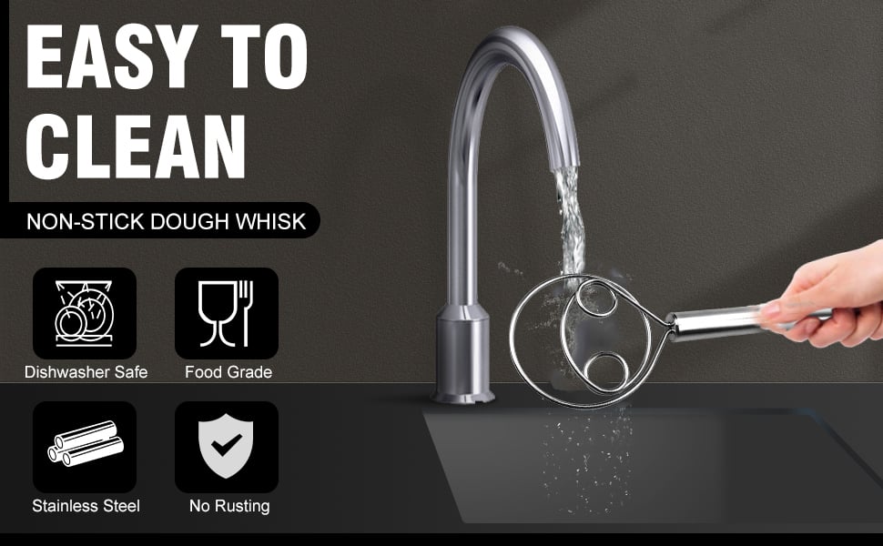 Easy to clean: Our Danish dough mixer is designed with smooth surface food-grade stainless steel, dough will not accumulate on the wire head, just wash the dough mixer with water after use to remove dough residue.