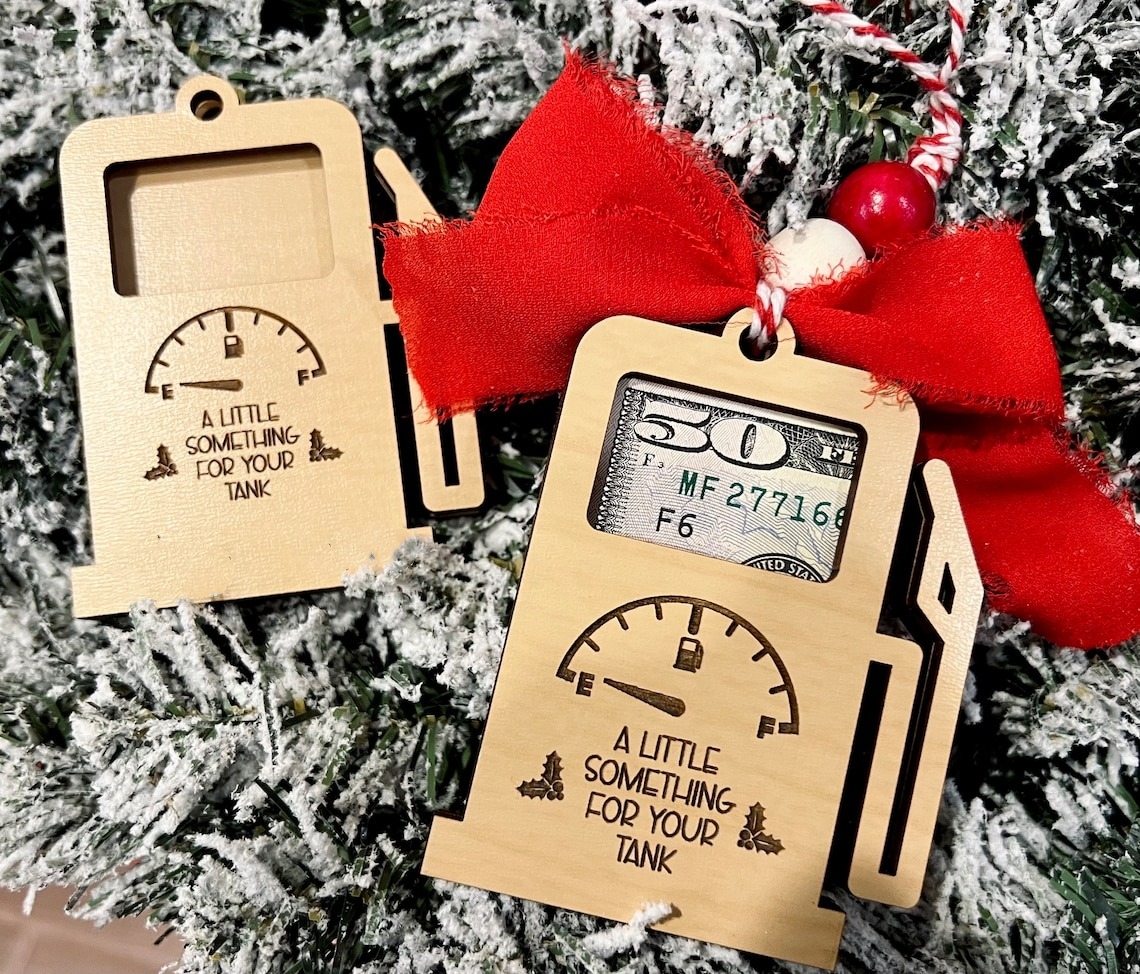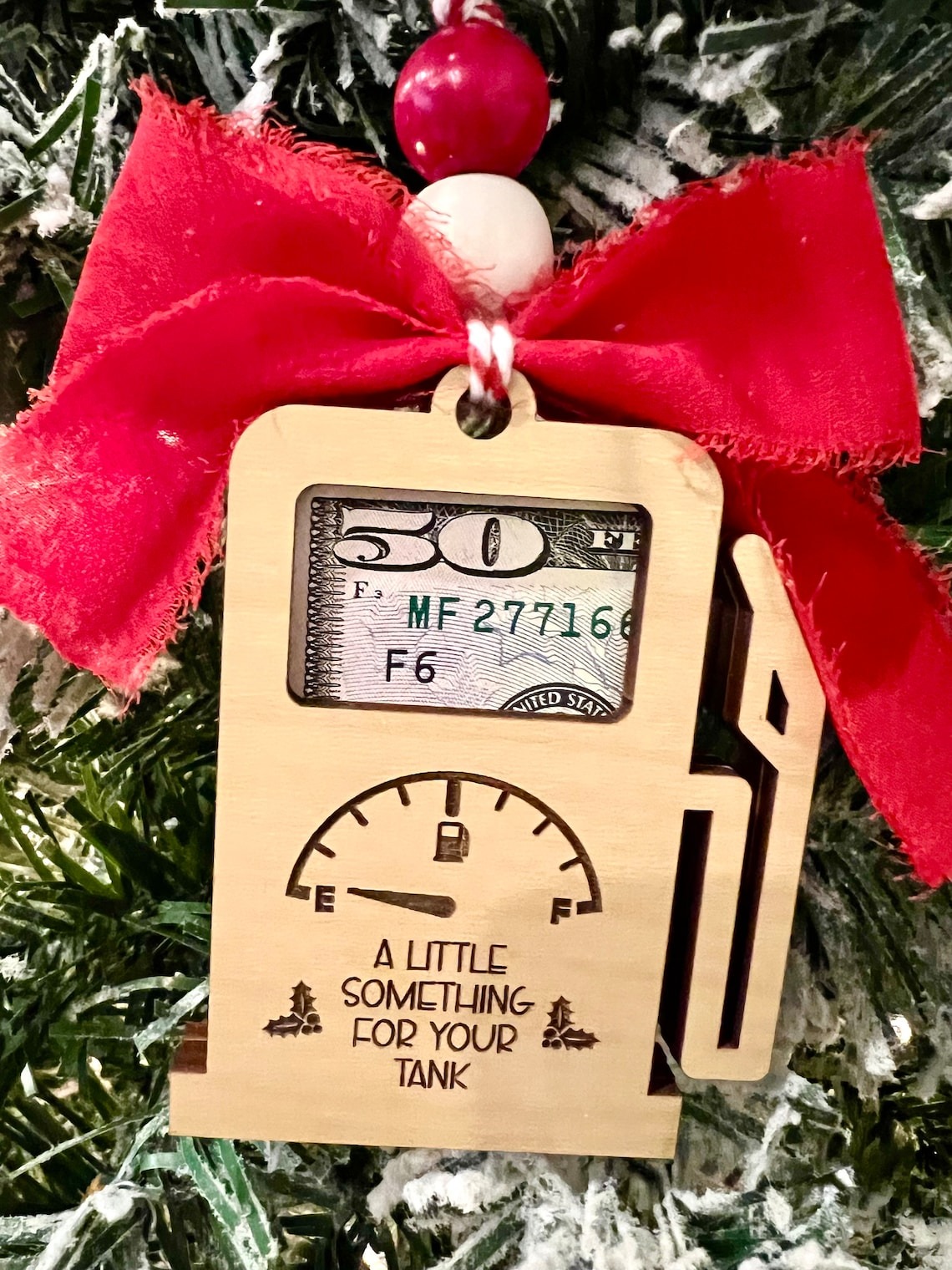 - This cute little gas can ornament allows you to fill your loved ones gas tanks by putting cash in the front compartment.
