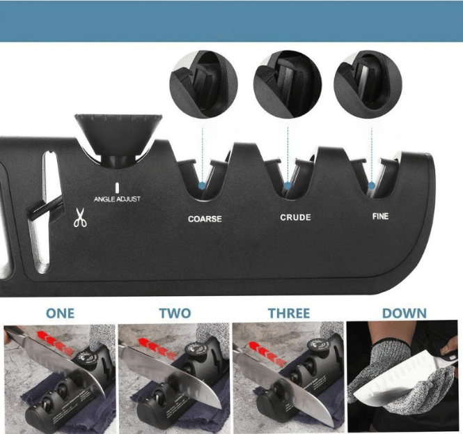 4 modes. Can realize scissors & meat knife & kitchen knife & fruit knife. Separate sharpening is more hygienic