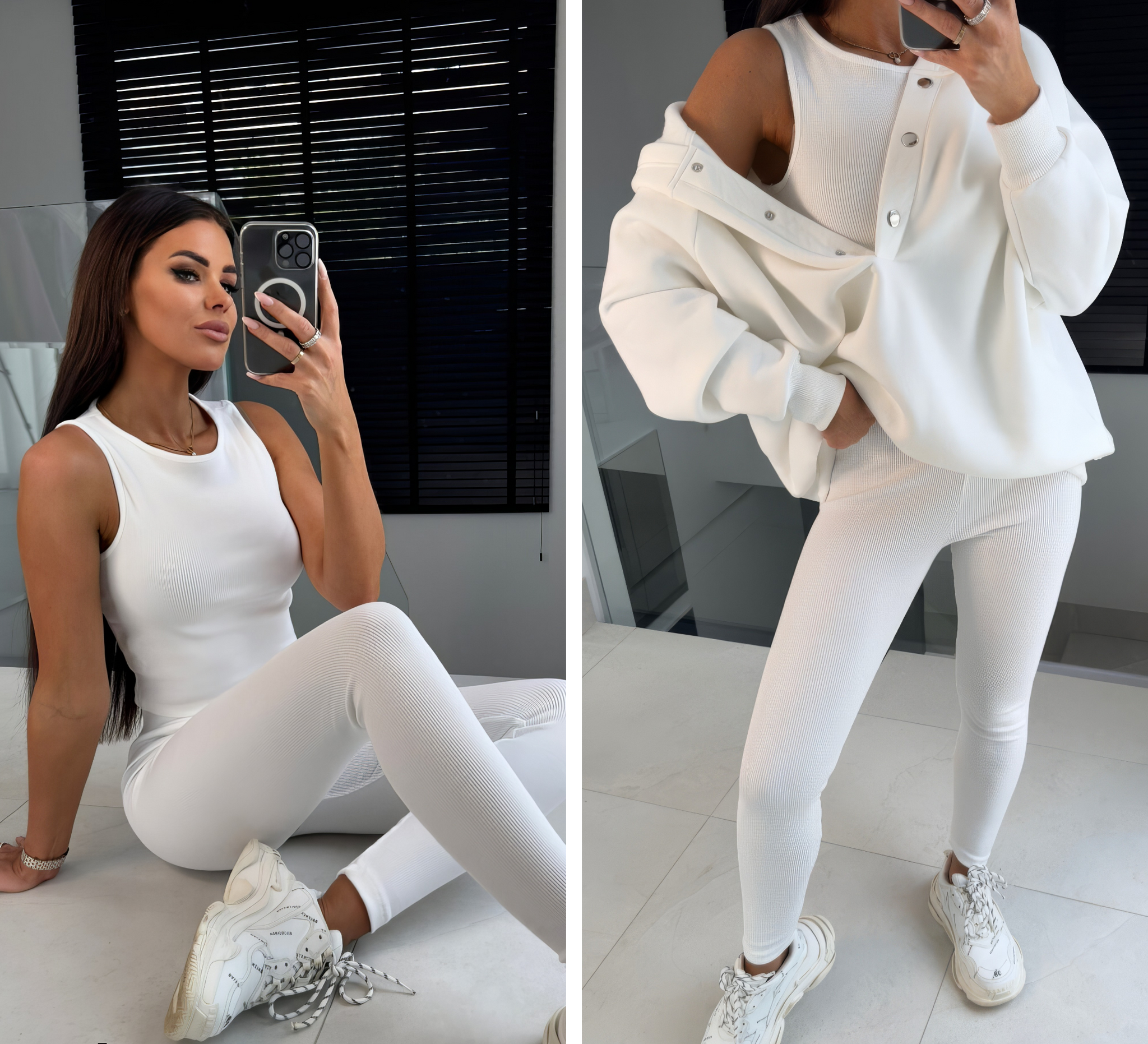 The sweatshirt has a button closure around the neck, while the ribbed leggings have an elastic waistband for optimal fit. The top completes the outfit perfectly. This set is an asset to the wardrobe of any woman looking for comfort and style. Made from superior material, this is an essential must-have!
