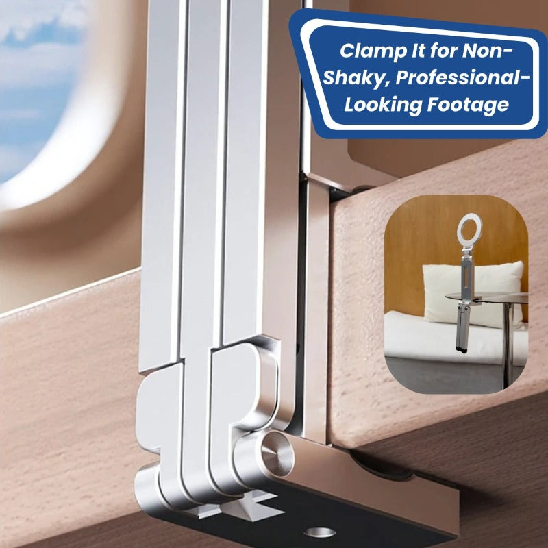 Hidden jaw grips desks, shelves, even luggage handles—film steady shots wherever inspiration hits.