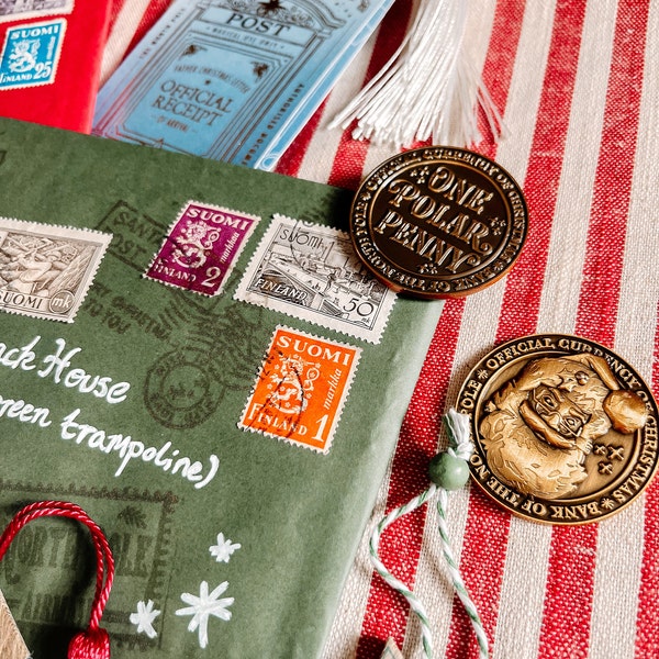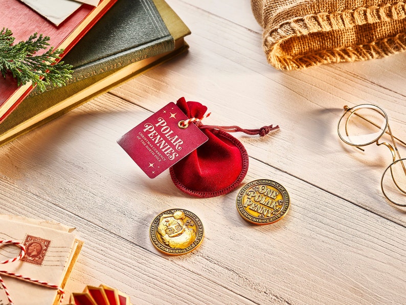 🦌Enter the enchanting world of Christmas wonder with our Polar Pennies – the official Tokens of the North Pole. accompanied with a deep red velvet drawstring pouch!