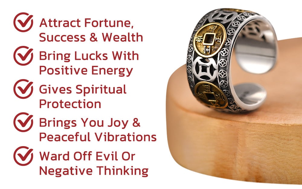 This ring helps you align your energy vibrations and manifest the prosperity and abundance of your dreams. The Chinese fortune coins, featuring the names of the powerful Qing emperors Qianlong, Yongzheng, Jiaqing, Shunzhi, and Kangxi, are believed to attract wealth and improve health and prosperity. By wearing this ring, you can tap into their positive energy and attract good fortune into your life.