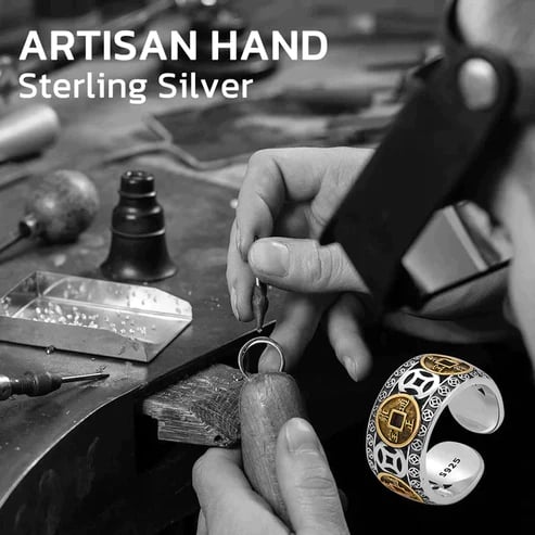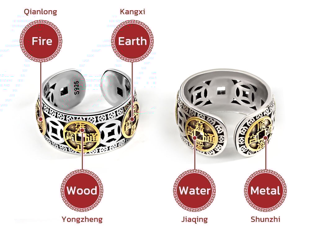 Chinese coins have long been used as potent amulets for attracting wealth and protection. A set of five coins is considered especially lucky. By incorporating Chinese coins and Feng Shui principles into your life, you can stimulate success and draw in positive energy and fortune. Our rings are meticulously handcrafted with sterling silver, ensuring durability, breathtaking shine, and a clear aesthetic.