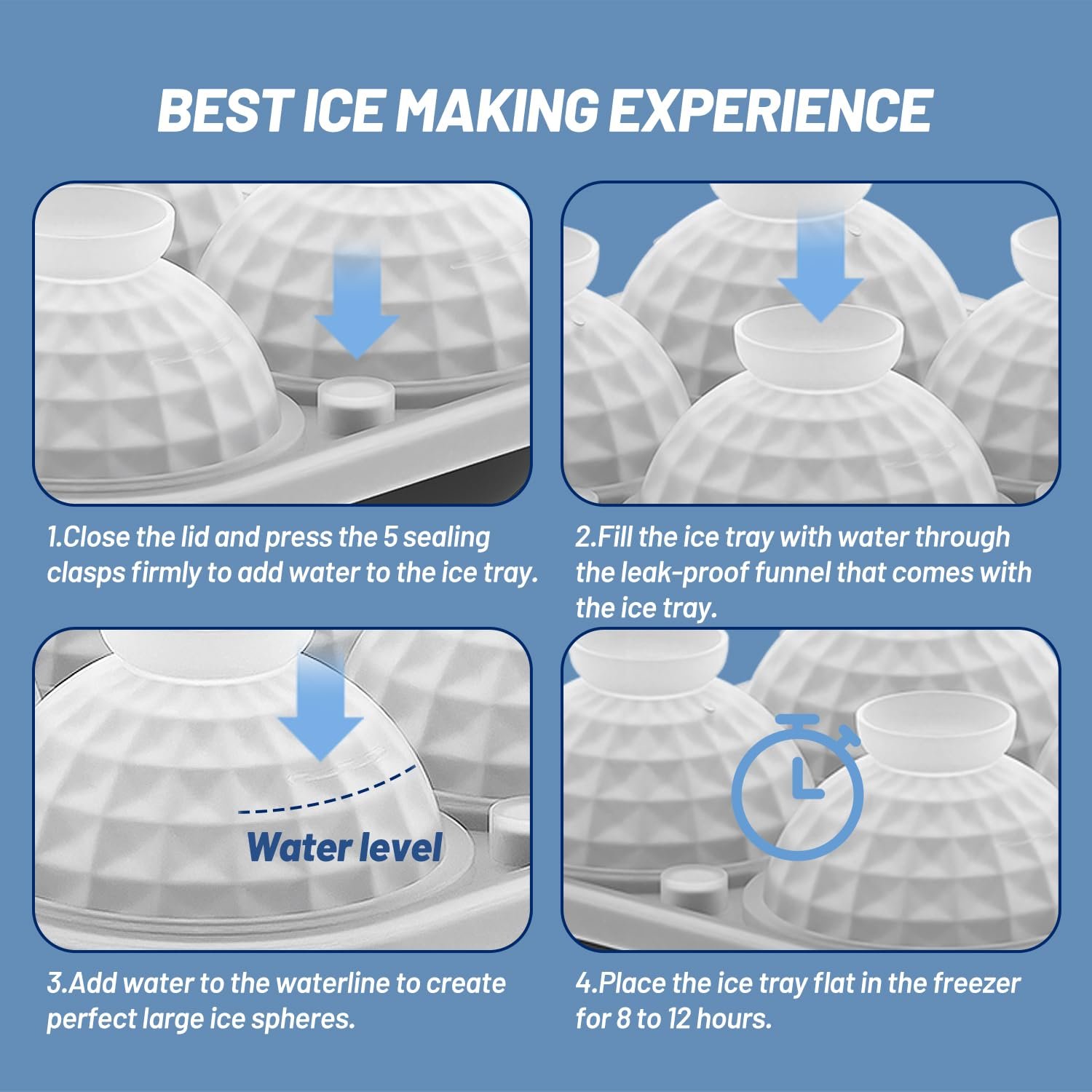 🧊 Easy to Fill - Our ice cube Mold is a breeze to fill! Simply pour your liquid into the mold,or or even better, directly fill it under the tap with water up to the waterline all at once, and then close the lid to squeeze out extra water. 4 giant ice cubes per ice mold. Perfect to chill cocktails, whiskey, tequila, vodka or other drinks with less dilution.
