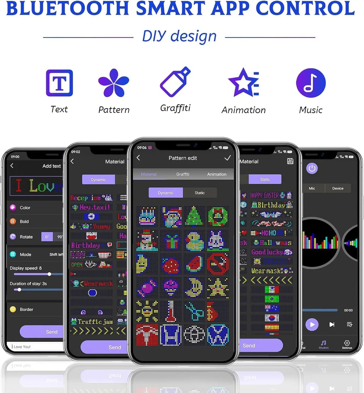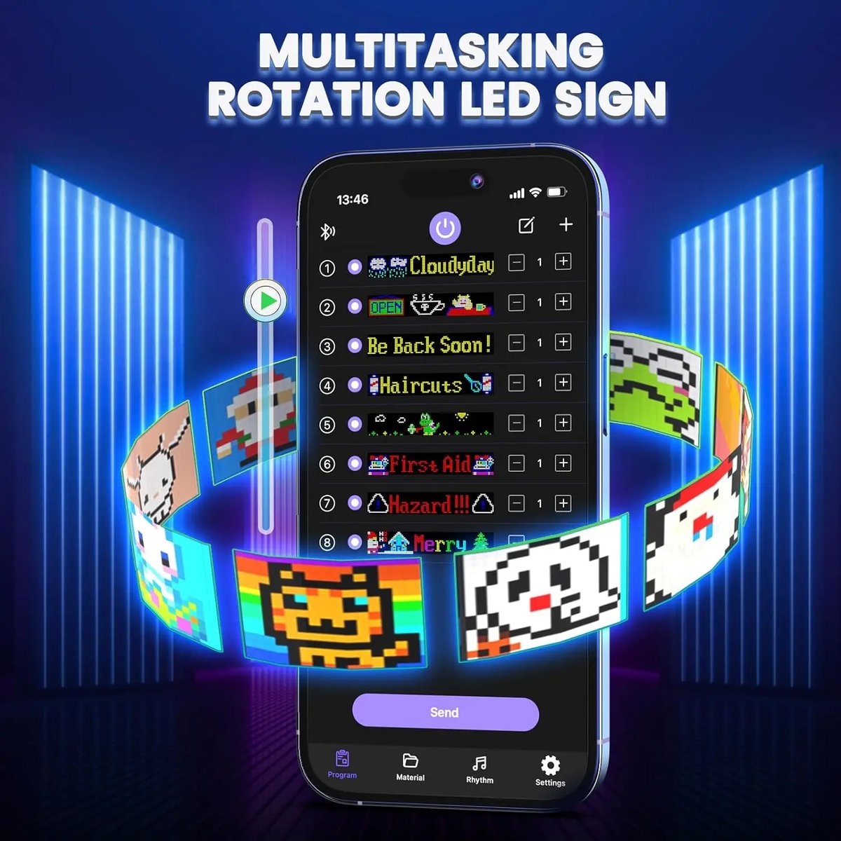 LED sign is controlled by a Bluetooth-connected app, which supports connecting multiple LED displays at the same time, making your store more eye-catching, the app has built-in many interesting modes and animations. Your phone makes it easier to customize fun patterns and text to personalize your store.