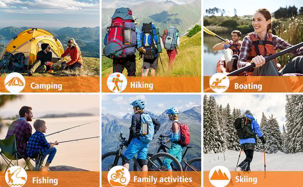 - [Sturdy & Durable Design for Outdoor] This solar battery pack is made to be IPX4 Waterproof/Dust-proof/Shockproof, which can withstand the harsh environment outdoors. It’s equipped with Dual super bright LED lights with SOS/Alarm/steady modes, a Must-Have for outdoor activities and home emergencies. The battery can support the flashlights for over 100 hrs!